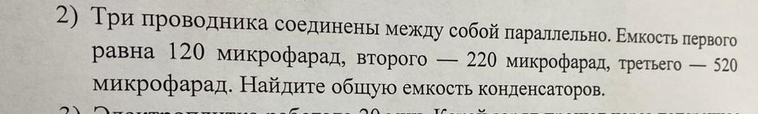 2) Три проводника соединены между собой параллельно. Емкость первого равна 120 микрофарад, второго 220 микрофарад, третьего 520 микрофарад. Найдите общую емкость конденсаторов.