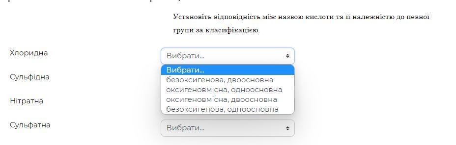 Установіть відповідність між назвою кислоти та її належністю до певної групи за класифікацією.