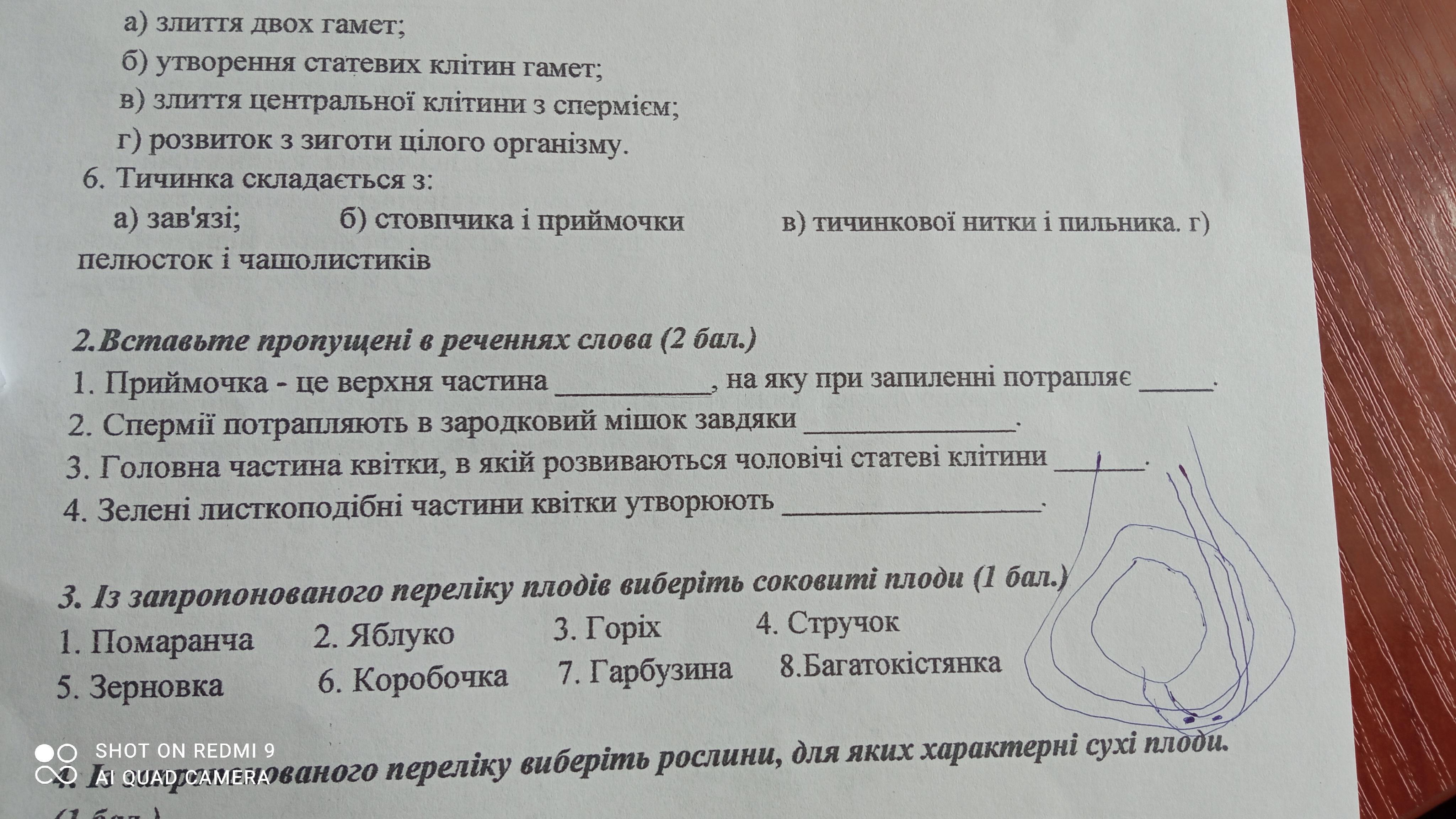 1.Приймочка - це верхня частина маточки, на яку при запиленні потрапляє пилок.