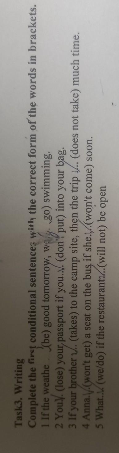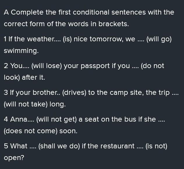 Task3. Writing Complete the first conditional sentences with the correct form of the words in brackets. I If the weather. (be) good tomorrow, wego) swimming. 2 You (lose) your passport if you... (don't put) into your bag. 3 If your brother .. (takes) to the camp site, then the trip .. (does not take) much time. 4 Anna. (won't get) a seat on the bus if she...(won't come) soon. 5 What..(we/do) if the restaurant..(will not) be open