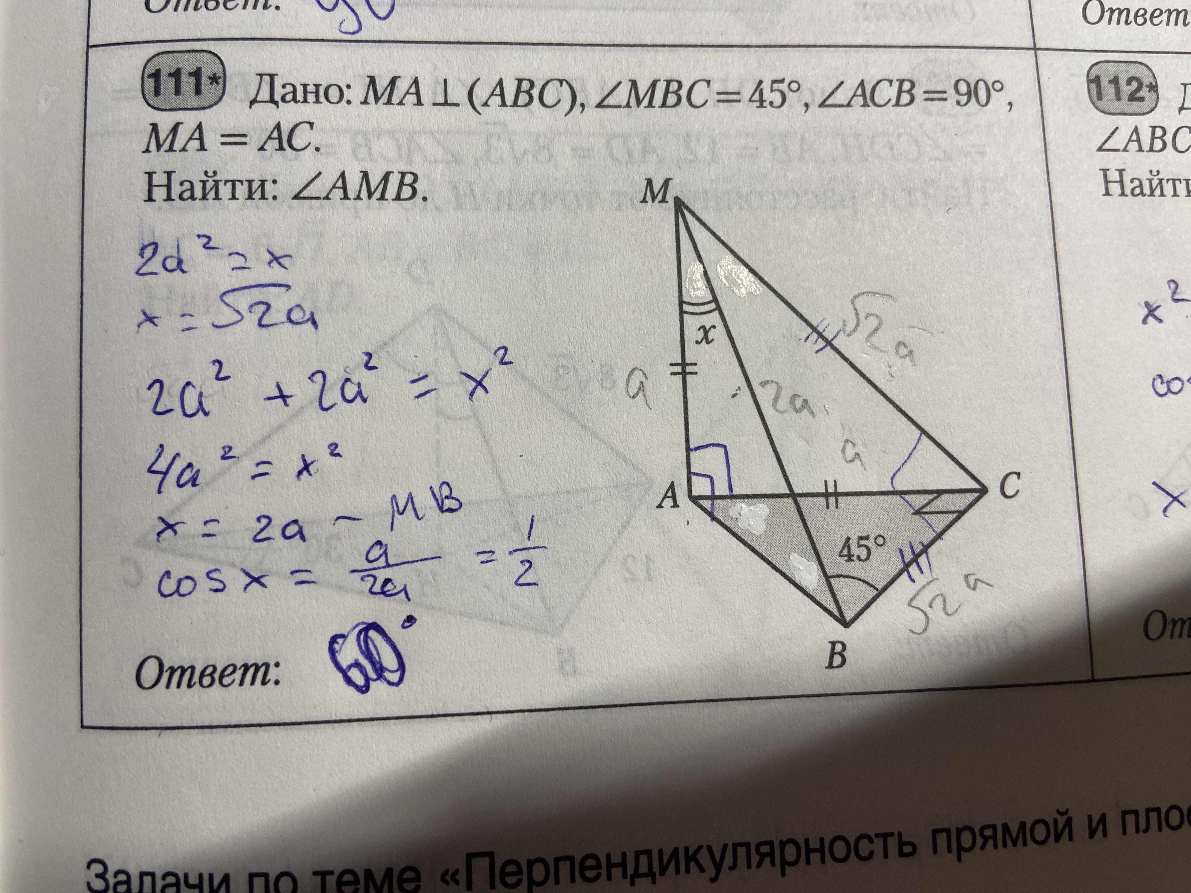 Отрезок MA проведен перпендикулярно плоскости треугольника ABC. угол MBC = 45°. угол ACB =90°. MA=AC. Найдите угол AMB.
