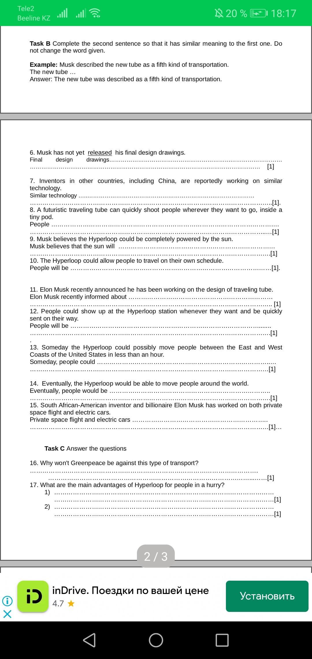 Помогите пожалуйста срочно Task b complete the second sentence so that it has similar meaning not change word given. example: musk described the new tube as a fifth kind of transportation. the new tube … answer: the new tube was described as a fifth kind of transportation. 6. musk has not yet released his final design drawings. final design drawings… [1] 7. inventors in other countries, including china, are reportedly working on similar technology. similar technology … …[1]. 8. a futuristic traveling tube can quickly shoot people wherever they want to go, inside a tiny pod. people … 9. musk believes the hyperloop could be completely powered by the sun. musk believes that the sun will 10. the hyperloop could allow people to travel on their own schedule. people will be …
