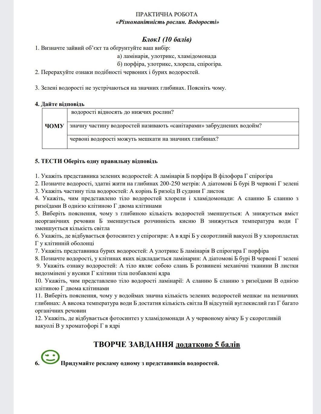 4. Дайте відповідь водорості відносять до нижчих рослин? ЧОМУ значну частину водоростей називають «санітарами» забруднених водойм? червоні водорості можуть мешкати на значних глибинах? 5. ТЕСТИ Оберіть одну правильну відповідь 1. Укажіть представника зелених водоростей: А ламінарія Б порфіра в філофора Г спірогіра 2. Позначте водорості, здатні жити на глибинах 200-250 метрів: А діатомові Б бурі в червоні Г зелені 3. Укажіть частностей: А корінь Б ризоїд В судини Г листок 4. Укажіть, чим представлено тіло водоростей хлорели і хламідомонади: А сланню Б сланню з ризоїдами в однією клітиною Г двома клітинами 5. Виберіть пояснення, чому з глибиною кількість водоростей зменшується: А знижується вміст неорганічних речовин Б зменшується розчинність кисню в знижується температура води г зменшується кiлькiсть свiтла 6. Укажіть, де відбувається фотосинтез у спірогири: А в ядрі Б у скоротливій вакуолі в у хлоропластах Г у клітинній оболонці 7. Укажіть представника бурих водоростей: А улотрикс Б ламінарія В спірогира Г порфіра 8. Позначте водорості, у клітинах яких відкладається ламінарин: А діатомові Б бурі в червоні Г зелені 9. Укажіть ознаку водоростей: А тіло являє собою слань Б розвинені механічні тканини в листки видозмінені у вусики Гра 10. Укажіть, чим представлено водорості ламінарії: А сланню Б сланню з ризоїдами в однією клітиною Г двома клітинами 11. Виберіть пояснення, чому у водоймах значна кiлькiсть зелених водоростей мешкає на незначних