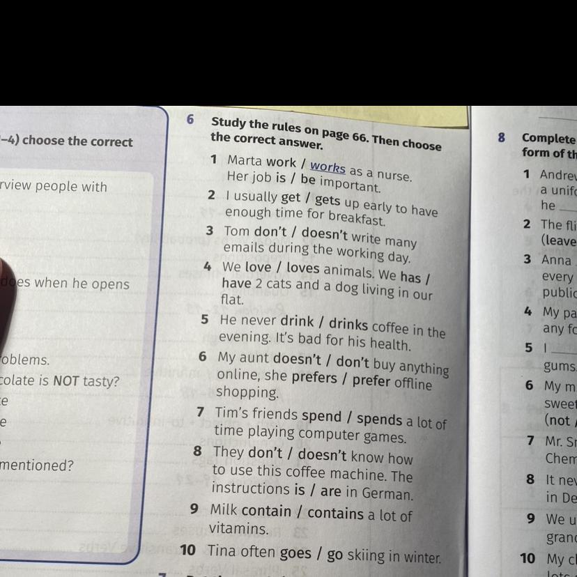 2 get 3 doesn’t 4 love .. have 5 drinks 6 doesn’t..prefers 7 spend 8 don’t ..are 9 contains 10 goes