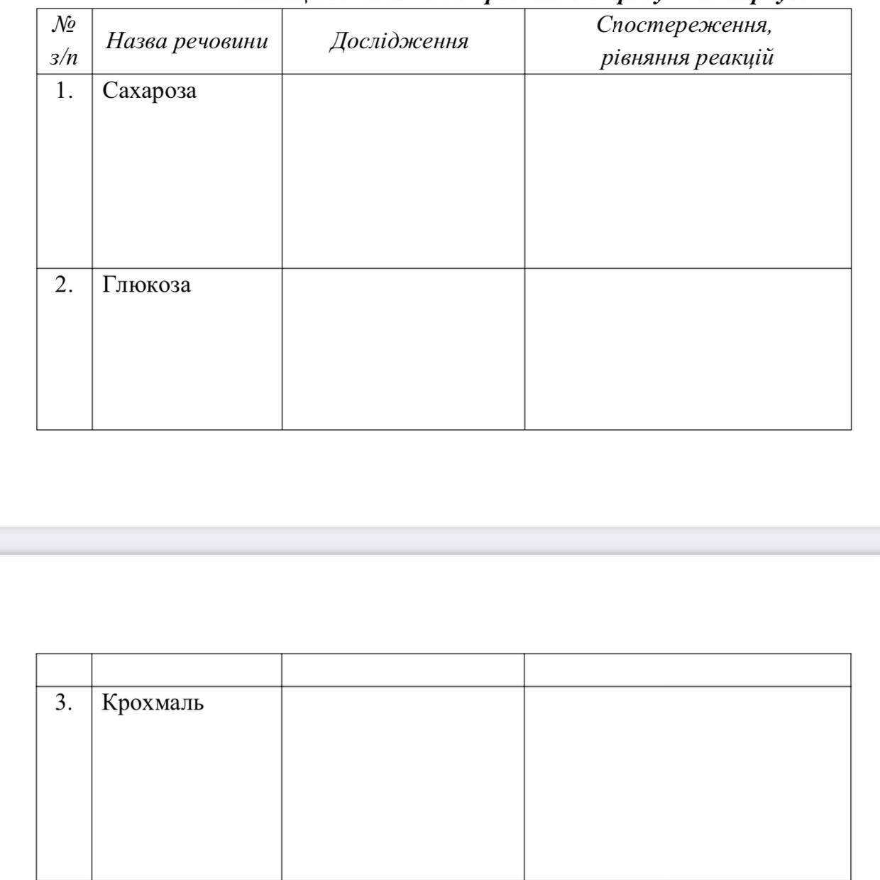 У трьох скланках без підписів знаходяться тверді речовини: сахароза, глюкоза та крохмаль. Складіть план експерименту та здійсніть реакції для розпізнавання цих речовин. Дослідження, спостереження та рівняння реакцій занесіть до таблиці.