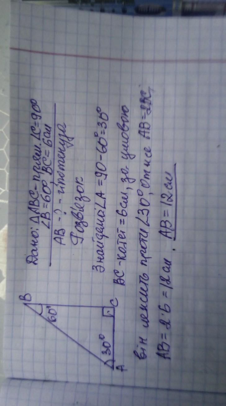 У прямокутному трикутнику ABC кут B=60*, катет BC=6см. Знайдить гипотенузу AB