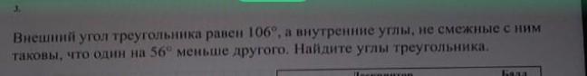 Внешний угол треугольника равен 106°, а внутренние углы, не смежные с ним таковы, что один на 56° меньше другого. Найдите углы треугольника.