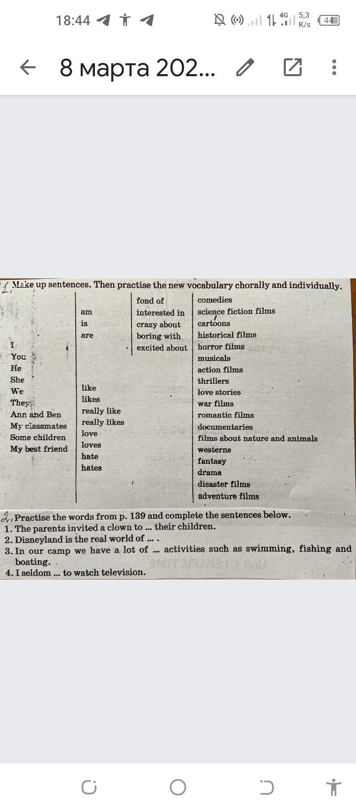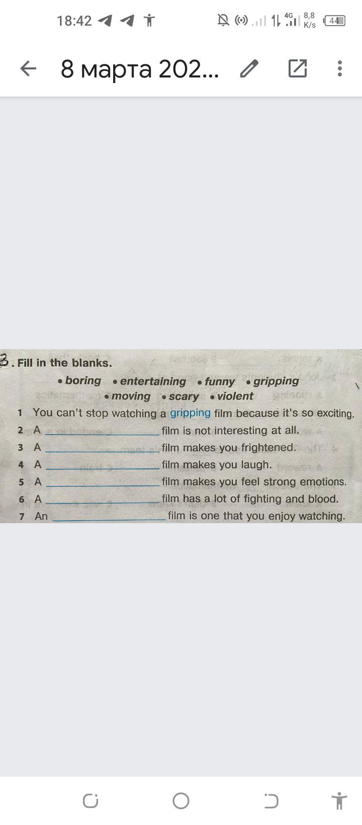 Ответ: N1 2) boring 3) scary 4) funny 5) violent 6) entertaining 7) moving