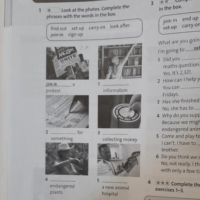 1.find out 2..sign up 3. curry on 4. look after 5. set up