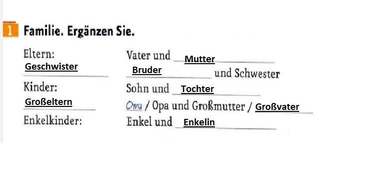 < menschen_a1_1_arbeitsb-24-25_Test3 TEST 1 Familie. Ergänzen Sie. Eltern: Kinder: Enkelkinder: Vater und und Schwester Sohn und Oma / Opa und Großmutter / Enkel und ☺ Q : ||