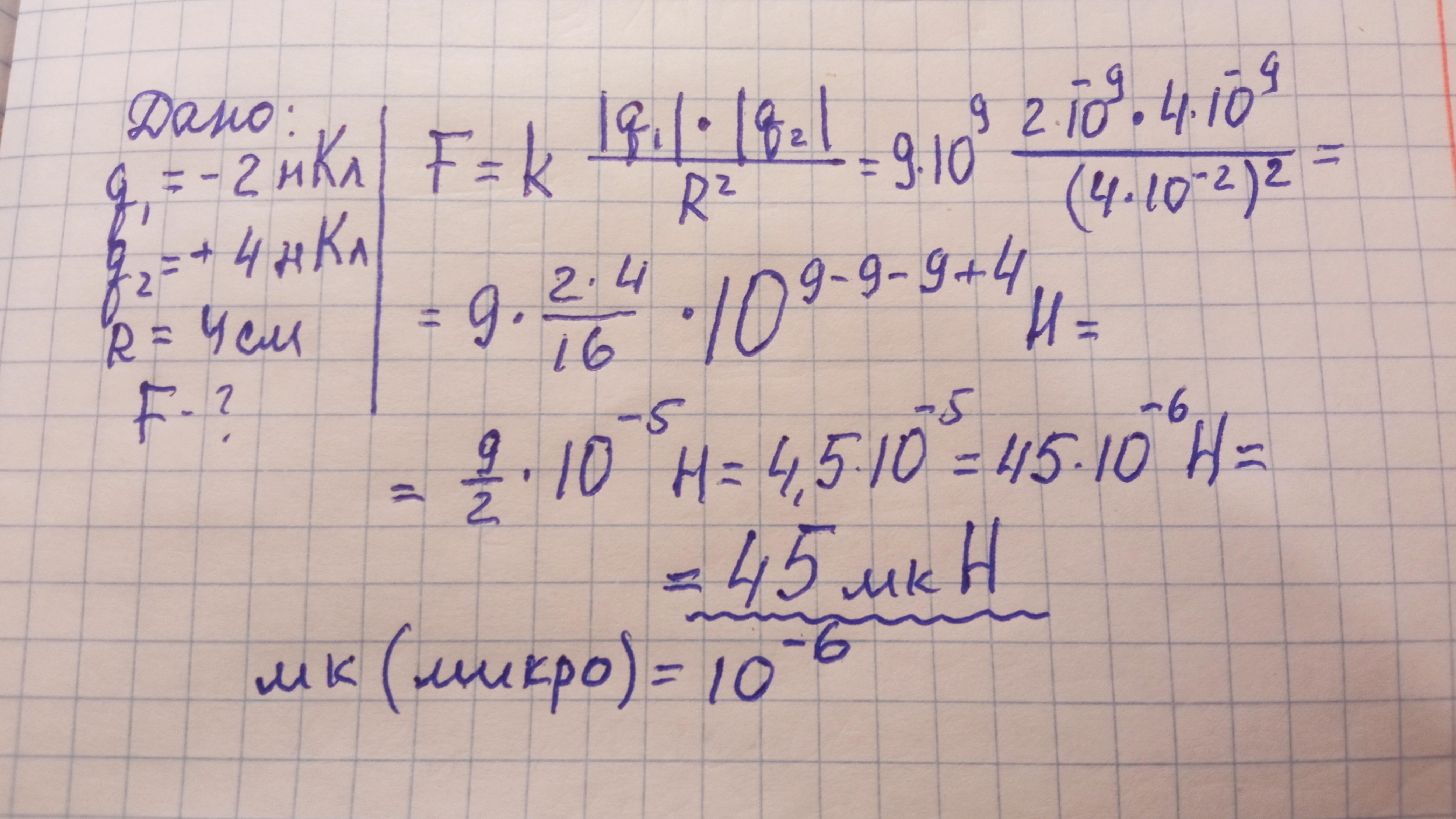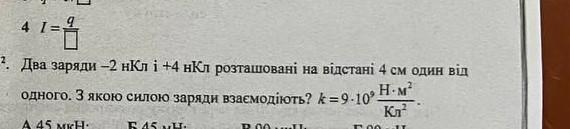 Два заряди-2 нКл i +4 нКл розташовані на відстані 4 см один від одного. З якою силою заряди взаємодіють? k=9-10 H-M² Кл А 45 мкн: Б 45 Мн: В 90 мкн F90 H