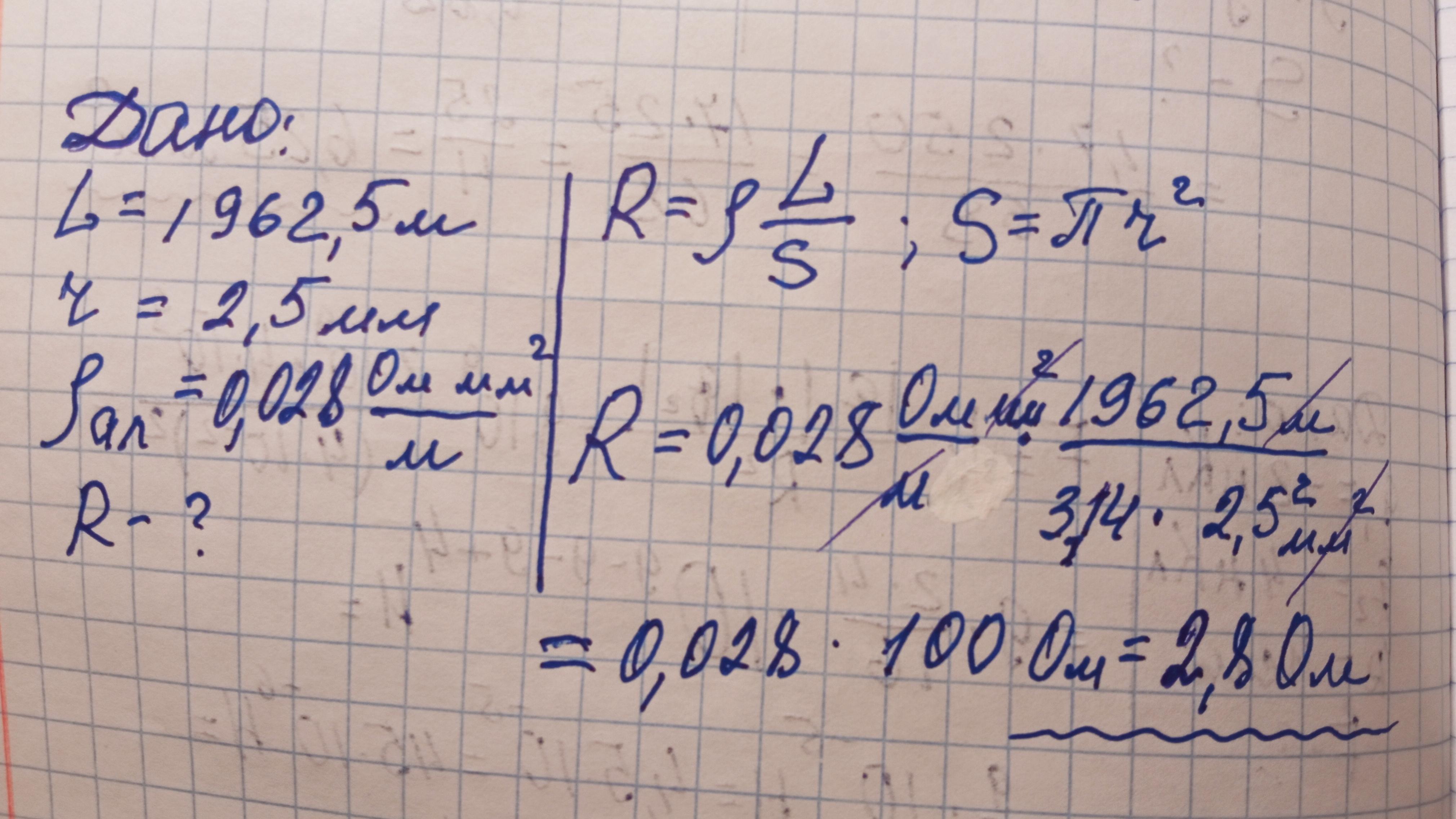 1). Якій опір має відрізок алюмінієвого дроту довжиною 1962,5 м, якщо радіус перерізу проволоки становить г = 2,5 мм? Площа круга: S = nr2 (це друга степінь).