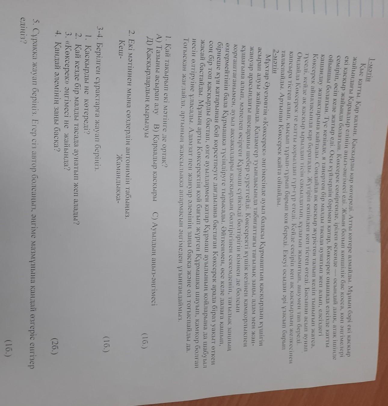 1. Кай такырып екi мәтінге де ортак? A) Тазыны асырап алу B) Караадыр каскыры Д) Каскырлардын кырылуы С) Ауылдын аңыз-әңгімесі 2. Екі мәтіннен мына сөздердiн антонимін табыңыз. Кеш- Жамандыкка- 3-4. Берілген сұрақтарға жауап беріңіз. 1. Каскырды не көтереді? 2. Қай кезде бiр малды тасада аунатып жеп алады? 3. «Көксерек» әңгiмесi не жайында? 4. Қандай элемiнiн заны баска? (16.) (16.) (26.) 5. Суракка жауап беріңіз. Егер сіз автор болсаныз, әнгіме мазмұнына кандай өзгеріс енгізер едiнiз? (16.)