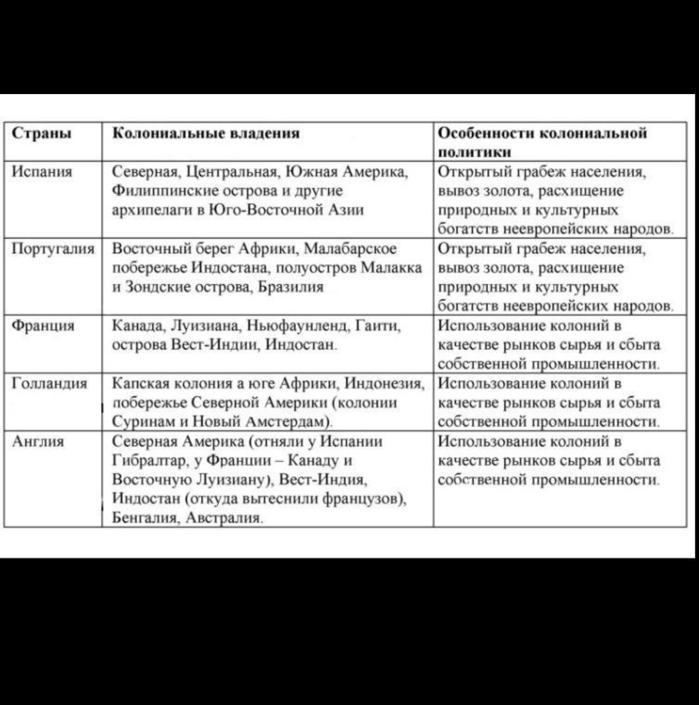 2. Раскройте особенности колониальной политики Испании и Португалии. Заполните таблицу, укажите не менее трех особенностей для каждой страны. Португалия Испания