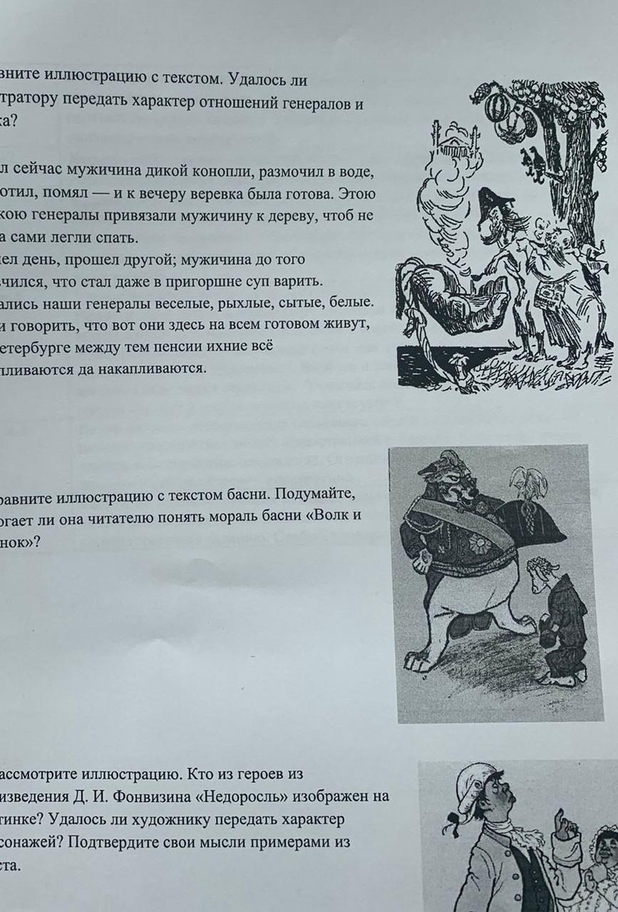 1. Сравните иллюстрацию с текстом. Удалось ли иллюстратору передать характер отношений генералов и мужика? Набрал сейчас мужичина дикой конопли, размочил в воде, поколотил, помял - и к вечеру веревка была готова. Этою веревкою генералы привязали мужичину к дереву, чтоб не убег, а сами легли спать. Прошел день, прошел другой; мужичина до того изловчился, что стал даже в пригоршне суп варить. Сделались наши генералы веселые, рыхлые, сытые, белые. Стали говорить, что вот они здесь на всем готовом живут, а в Петербурге между тем пенсии ихние всё накапливаются да накапливаются. 2. Сравните иллюстрацию с текстом басни. Подумайте, помогает ли она читателю понять мораль басни «Волк и ягнёнок»? 3. Рассмотрите иллюстрацию. Кто из героев из произведения Д. И. Фонвизина «Недоросль» изображен на картинке? Удалось ли художнику передать характер персонажей? Подтвердите свои мысли примерами из текста.