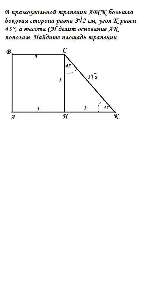 5.В прямоугольной трапеции АВСК большая боковая сторона равна 3√2 см, угол к равен 450, а высота СН делит основание АК пополам. Найдите площадь трапеции.