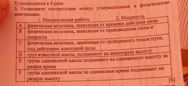 3. Установите соответствие между утверждениями и величинами: 1. Механическая работа 2. Мощно физическая величина, зависящая от времени дейст В физическая величина, зависящая от произведения с А скорости с С физическая величина, зависящая от пройденного те под действием некоторой силы груз известной массы, поднимают на некоторую в грузы одинаковой массы поднимают на одинакову разное время грузы одинаковой массы за одинаковое время под разную высоту D E F