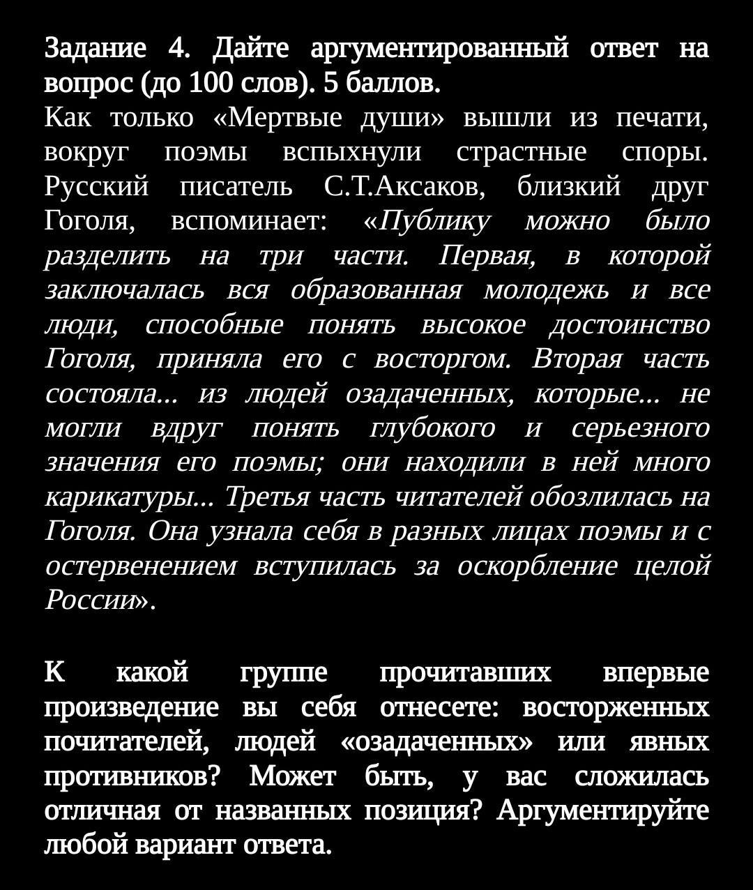 Срочно ! Дайте аргументированный ответ на вопрос (до 100 слов). 5 баллов. Как только «Мертвые души» вышли из печати, вокруг поэмы вспыхнули страстные споры. Русский писатель С.Т.Аксаков, близкий друг Гоголя, вспоминает: «Публику можно было разделить на три части. Первая, в которой заключалась вся образованная молодежь и все люди, способные понять высокое достоинство Гоголя, приняла его с восторгом. Вторая часть состояла... из людей озадаченных, которые... не могли вдруг понять глубокого и серьезного значения его поэмы; они находили в ней много карикатуры... Третья часть читателей обозлилась на Гоголя. Она узнала себя в разных лицах поэмы и с остервенением вступилась за оскорбление целой России».