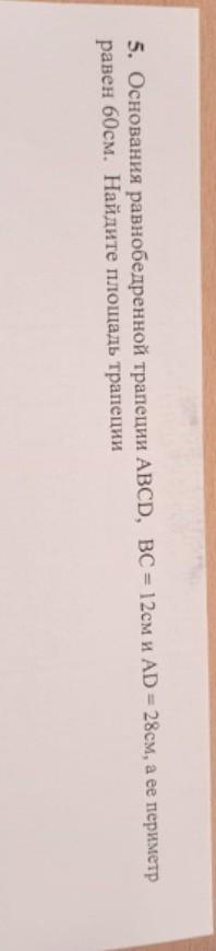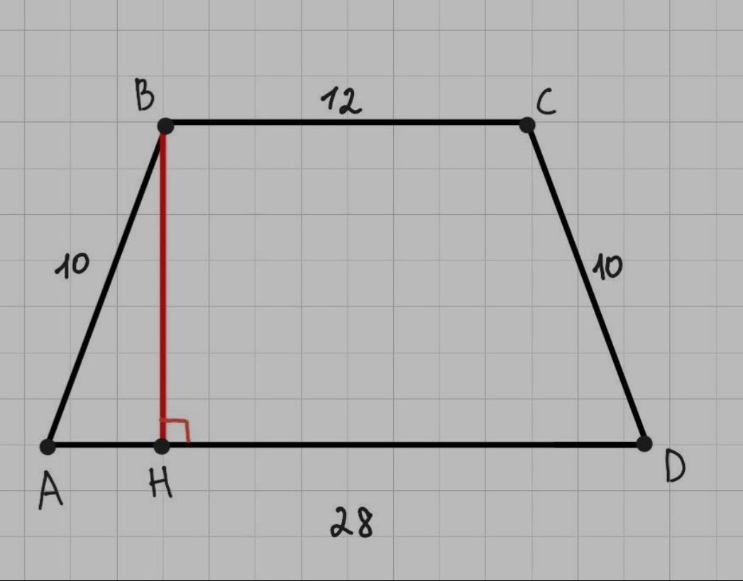 Дано: ABCD — равнобедренная трапеция, BC||AD, BC=12 см, AD=28 см, AB=CD=60 см.