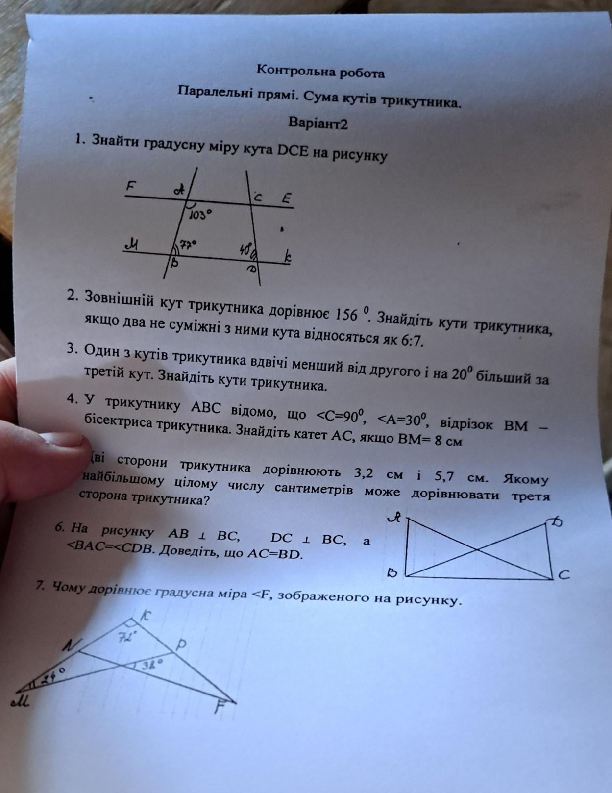Ml 1240 1. Знайти градусну міру кута DCE на рисунку F N М Контрольна робота Паралельні прямі. Сума кутів трикутника. Варiант2 103° C Д 2. Зовнішній кут трикутника дорівнює 156 °. Знайдіть кути трикутника, якщо два не суміжні з ними кута відносяться як 6:7. К A 3. Один з кутів трикутника вдвічі менший від другого і на 20º бiльший за третій кут. Знайдіть кути трикутника. 4. У трикутнику ABC відомо, що