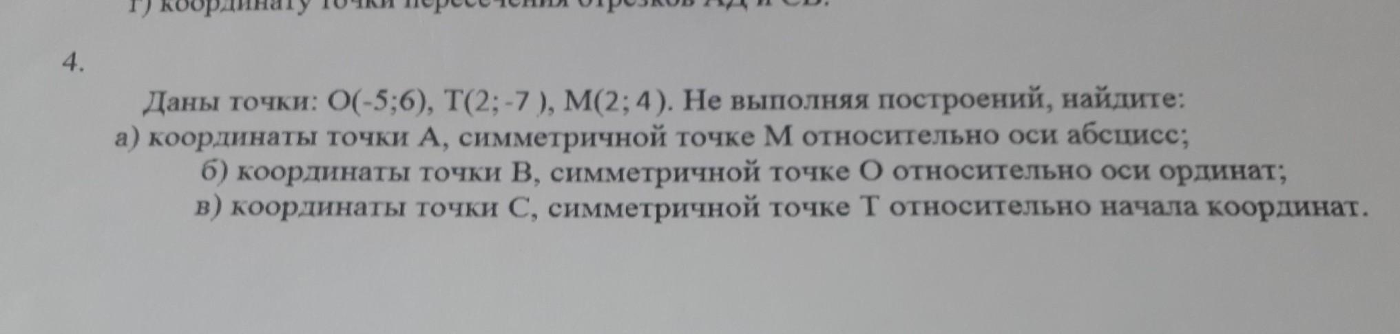 Даны точки: О(-5;6), T(2;-7), M(2; 4). Не выполняя построений, найдите: а) координаты точки А, симметричной точке М относительно оси абсцисс; б) координаты точки В, симметричной точке О относительно оси ординат; в) координаты точки С, симметричной точке Т относительно начала координат.