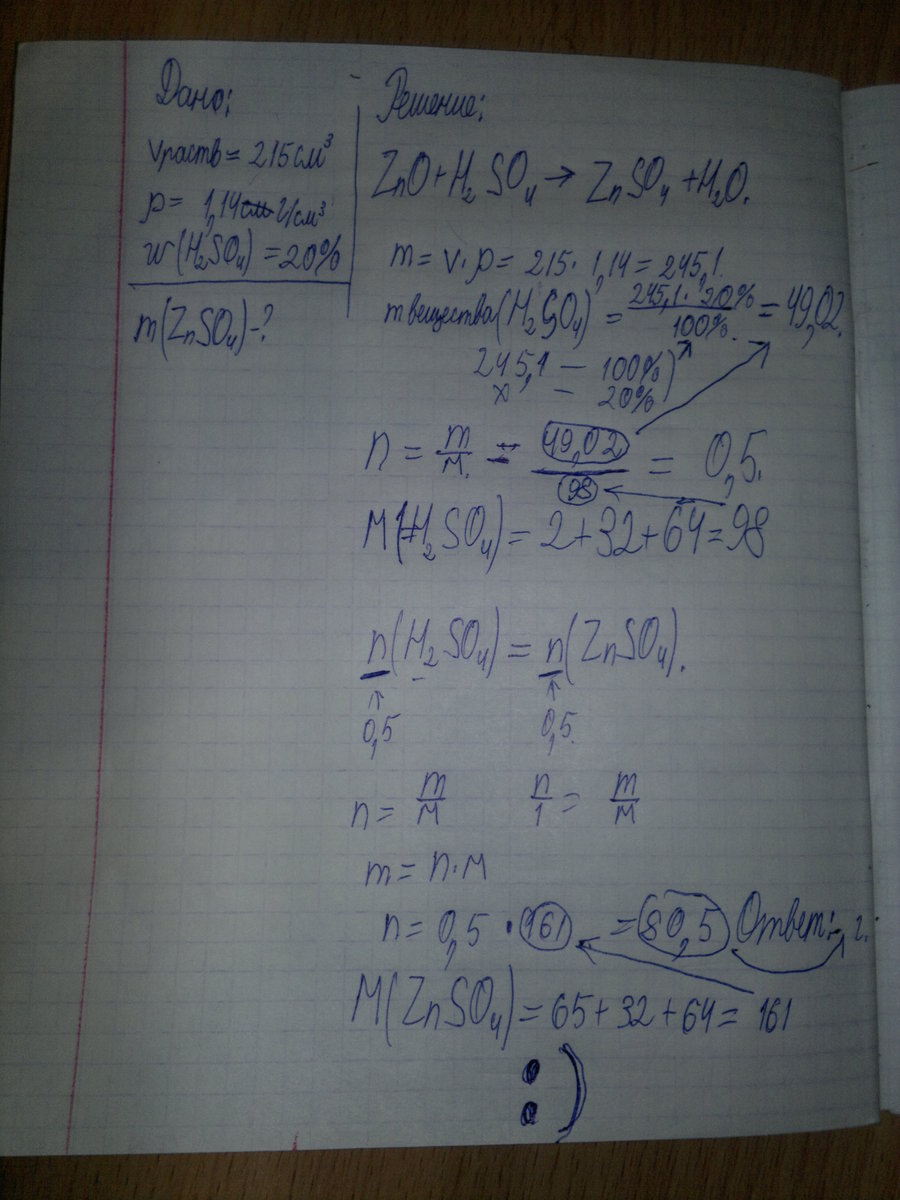 Оксид цинка обработали раствором объемом 215 см. в кубе ( р=1,14 г/см.в кубе)