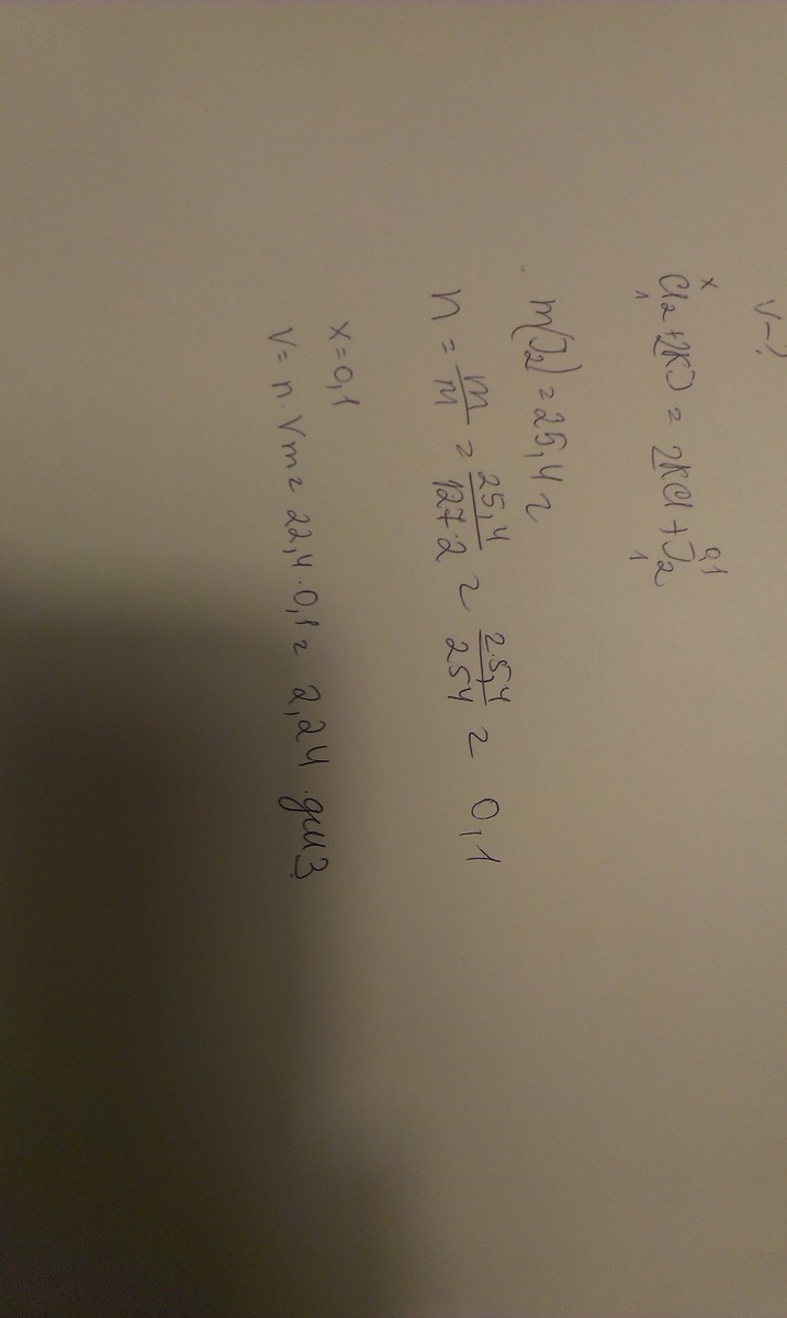 рассчитайте объем хлора, вступившего во взаимодействие с раствором иодида калия, если масса выделившегося иода равна 25,4 г.