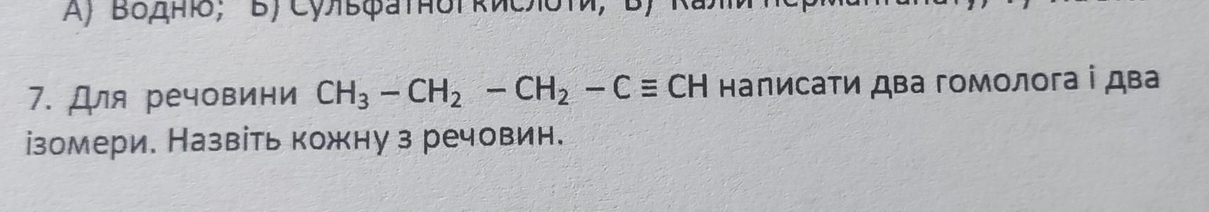 7. Для речовини СН3-СН2-СН2 - С = СН написати два гомолога і два ізомери. Назвіть кожну з речовин.