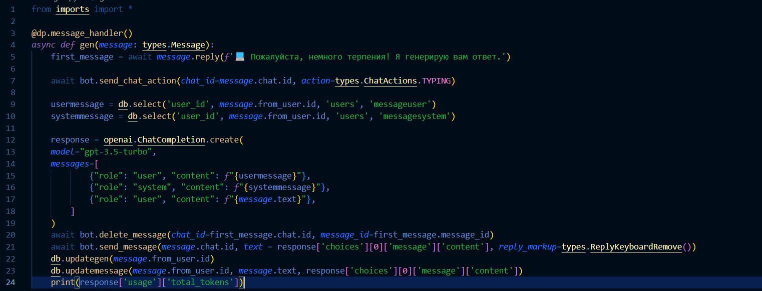 Этот код создает бота, который будет отвечать на каждое сообщение пользователя в отдельности, используя OpenAI API для генерации ответов. Функция generate_answer использует OpenAI API для получения ответа на сообщение пользователя. Обработчики сообщений бота зарегистрированы с помощью функции dp.message_handler(), которая будет вызываться каждый раз, когда бот получает сообщение от пользователя