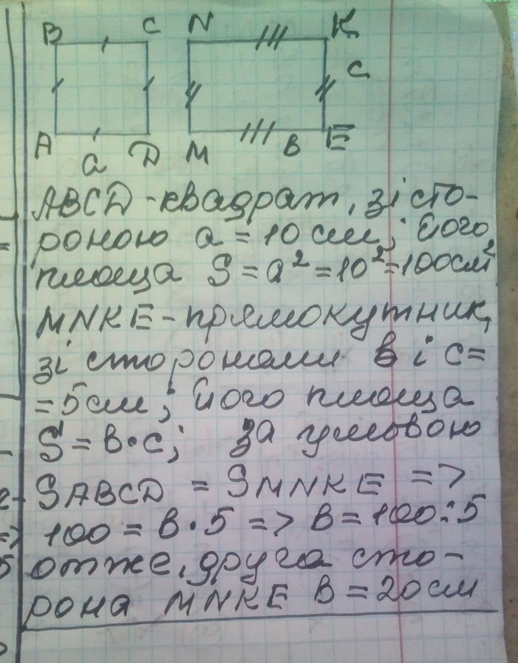 Квадрат і прямокутник мають однакові площі. Одна зі сторін прямокутника дорівнює 5 см, а сторона квадрата 10см. Знайдіть другу сторону прямокутника.