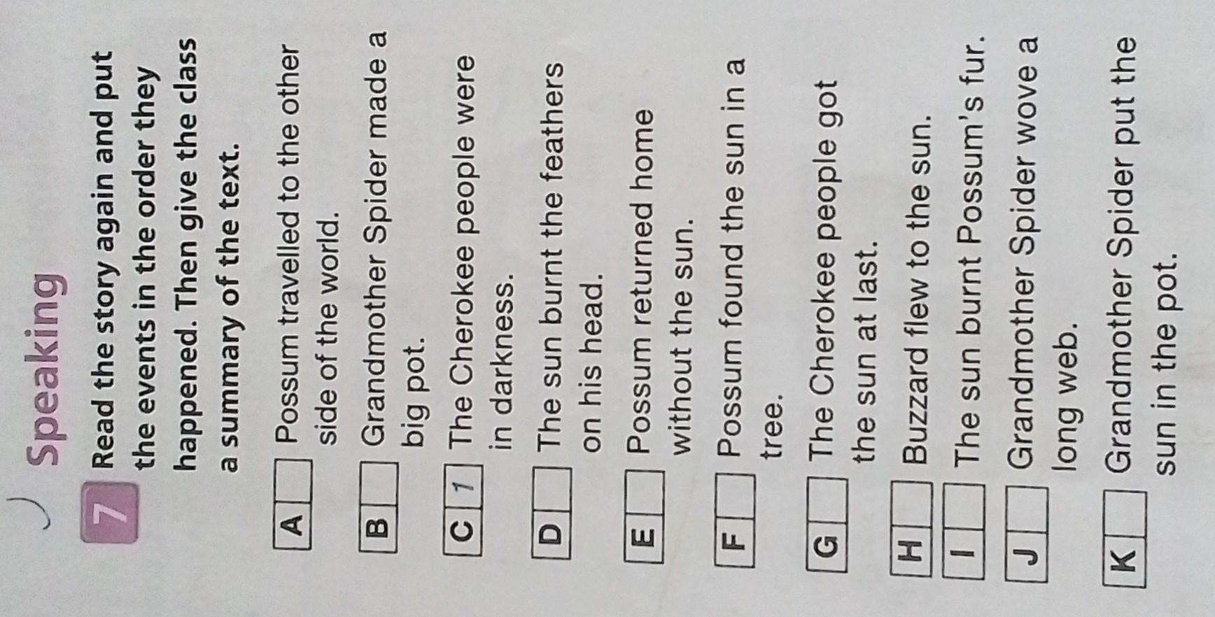 Summary: The Cherokee people were living in darkness. They asked the animals for help and Possum volunteered to go to the other side of the world to get the sun. On his way back, the sun burnt his fur and he dropped it, causing the sun to disappear. The animals then tried to get the sun back with Buzzard eventually succeeding, but the sun was too hot and burnt the feathers on his head. Finally, Grandmother Spider was able to retrieve the sun and put it in a pot, bringing light back to the Cherokee people.