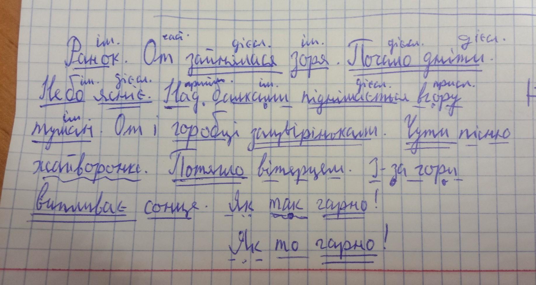 Ранок. От зайнялася зоря. Почало днiти. Небо ясніє. Над балками піднімається вгору туман. От і горобці зацвірінькали. Чути пісню жайворонка. Потягло вітерцем. З-за гори випливає сонце. Як ток гарно! Підкреслити члени речення та написати частини мови у 1-3 реченнях будь ласка