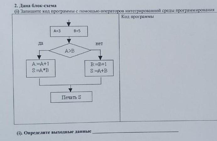 на блок-схема апишите код программы с помощью операторов интегрированной среды программирования Код программы да A=A+1 S=A+B A=3 B=5 ADB Печать S нет B =B+1 S: A+B Определите выходные данные. Пожалуйста помогите