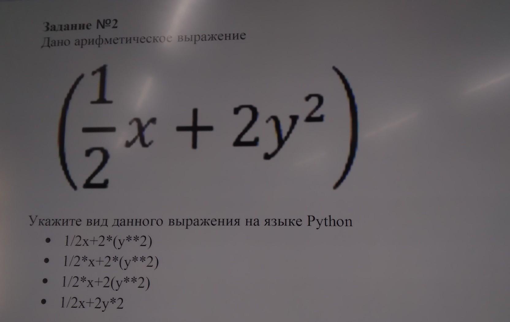 Задание №2 Дано арифметическое выражение 1 (=/x+2y²) Укажите вид данного выражения на языке Python 1/2x+2*(y**2) 1/2*x+2*(y**2) • 1/2*x+2(y**2) • 1/2x+2y*2 ●