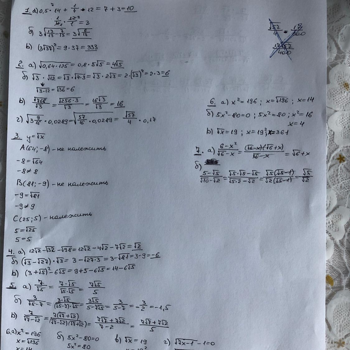 ??? Ну, например, 1а) =0,5*14+12/4=7+3=10; 2г) =sqrt(57*289/16*10000)=17*sqrt(57)/(4*100)=17*sqrt(57)/400=0.320868.... 6г) 7х-1=1; х=2/7. ... Ну и т.д.