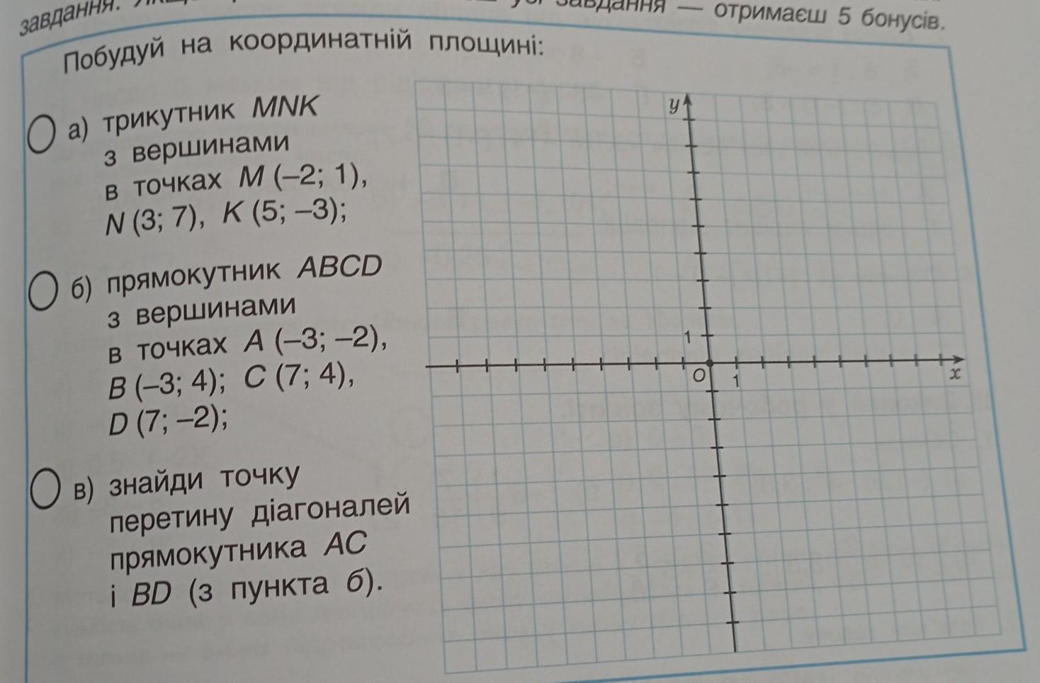 а) ТРИКУТНИК MNK з вершинами в точках М (-2; 1), N (3; 7), K (5; -3); б) прямокутник ABCD з вершинами в точках A (-3; -2), В (-3; 4); С (7; 4), D (7; -2); в) знайди точку перетину діагоналей прямокутника АС i BD (з пункта б). О 1 AX