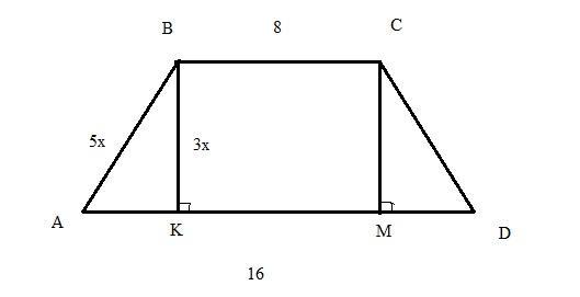 Основи рівнобічної трапеції дорівнюють 8 см і 16 см, а бічна сторона відноситься до висоти як 5:3. Знайдіть периметр трапеції.