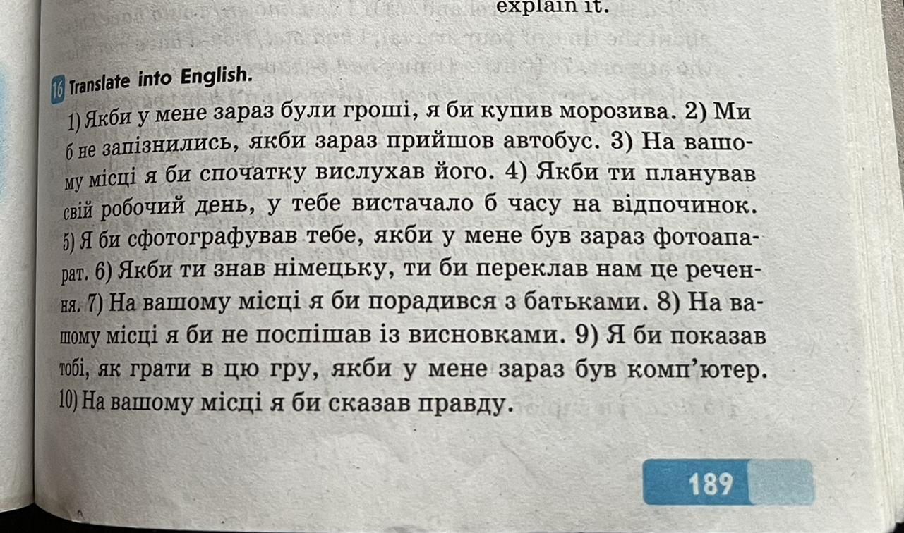 1) If I had money right now, I would buy ice cream. 2) We wouldn't be late if the bus came now. 3) If I were you, I would listen to him first. 4) If you planned your working day, you would have enough time for rest. 5) I would take a picture of you if I had a camera now. 6) If you knew German, you would translate this sentence for us. 7) If I were you, I would consult with my parents. 8) If I were you, I would not rush to conclusions. 9) I would show you how to play this game if I had a computer right now. 10) If I were you, I would tell the truth.