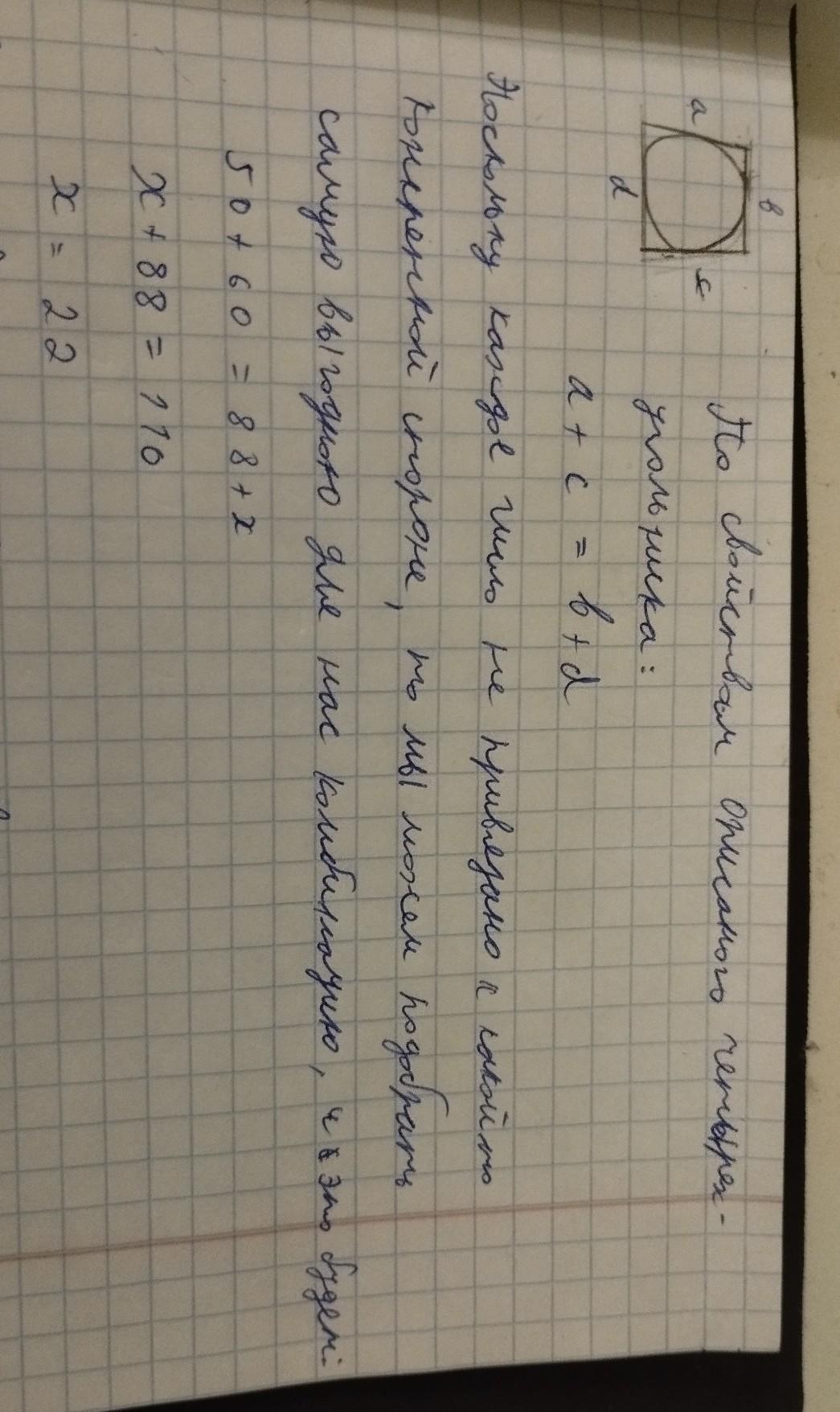 Известно, что в четырёхугольник вписана окружность, а длины трёх из сторон этого четырёхугольника равны 50,60,88. Какое наименьшее значение может иметь длина четвёртой стороны этого четырёхугольника?