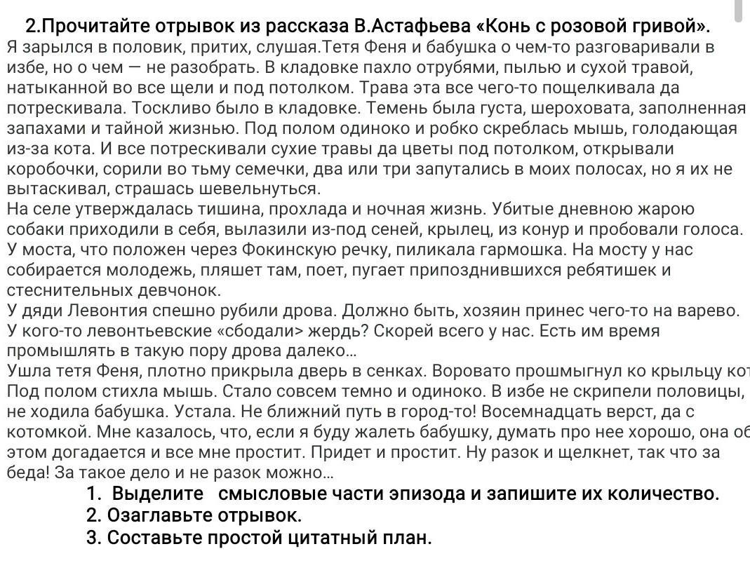 2.Прочитайте отрывок из рассказа В.Астафьева «Конь с розовой гривой». Я зарылся в половик, притих, слушая. Тетя Феня и бабушка о чем-то разговаривали в избе, но о чем - не разобрать. В кладовке пахло отрубями, пылью и сухой травой, натыканной во все щели и под потолком. Трава эта все чего-то пощелкивала да потрескивала. Тоскливо было в кладовке. Темень была густа, шероховата, заполненна запахами и тайной жизнью. Под полом одиноко и робко скреблась мышь, голодающая из-за кота. И все потрескивали сухие травы да цветы под потолком, открывали коробочки, сорили во тьму семечки, два или три запутались в моих полосах, но я их не вытаскивал, страшась шевельнуться. На селе утверждалась тишина, прохлада и ночная жизнь. Убитые дневною жарою собаки приходили в себя, вылазили из-под сеней, крылец, из конур и пробовали голоса У моста, что положен через Фокинскую речку, пиликала гармошка. На мосту у нас собирается молодежь, пляшет там, поет, пугает припозднившихся ребятишек и стеснительных девчонок. У дяди Левонтия спешно рубили дрова. Должно быть, хозяин принес чего-то на варево У кого-то левонтьевские «сбодали> жердь? Скорей всего у нас. Есть им время промышлять в такую пору дрова далеко... Ушла тетя Феня, плотно прикрыла дверь в сенках. Воровато прошмыгнул ко крыльцу к Под полом стихла мышь. Стало совсем темно и одиноко. В избе не скрипели половиць не ходила бабушка. Устала. Не ближний путь в город-то! Восемнадцать верст, да с котомкой. Мне казалось, что, если я буду жалеть бабушку, думать про нее хорошо, она этом догадается и все мне простит. Придет и простит. Ну разок и щелкнет, так что за беда! За такое дело и не разок можно... 1. Выделите смысловые части эпизода и запишите их количество. 2. Озаглавьте отрывок. 3. Составьте простой цитатный план.