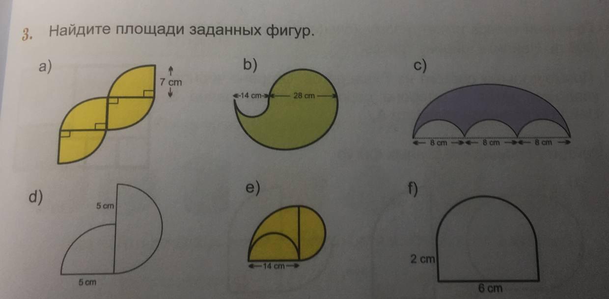 b)здесь по сути к полукругу диаметром D1=14+28=42см прибавили полукруг диаметром D2=28см и отняли полукруг диаметром D3=14см.