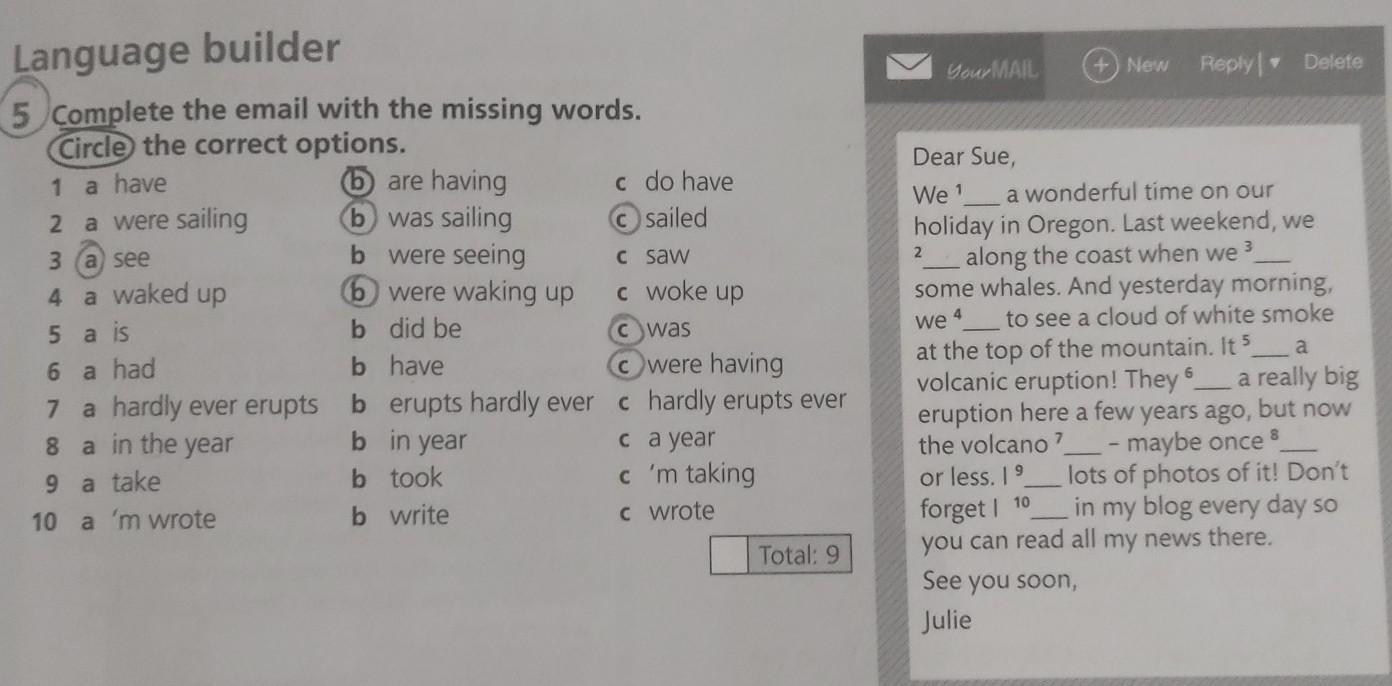 Language builder 5 Complete the email with the missing words. Circle the correct options. bare having 1 a have 2 a were sailing b was sailing 3 (a) see b were seeing 6 were waking up 4 a waked up 5 a is b did be was 6 a had b have Owere having 7 a hardly ever erupts b erupts hardly ever c hardly erupts ever 8 a in the year b in year took c a year 9 a take b c'm taking 10 a 'm wrote b write c wrote c do have Osailed c saw c woke up Total: 9 YourMAIL 2 +New Reply Delete Dear Sue, a wonderful time on our 3 We 1 holiday in Oregon. Last weekend, we along the coast when we some whales. And yesterday morning, we 4 to see a cloud of white smoke at the top of the mountain. It a volcanic eruption! They 6 a really big eruption here a few years ago, but now the volcano maybe once 8 or less, 19 lots of photos of it! Don't 10 forget in my blog every day so you can read all my news there. See you soon, Julie