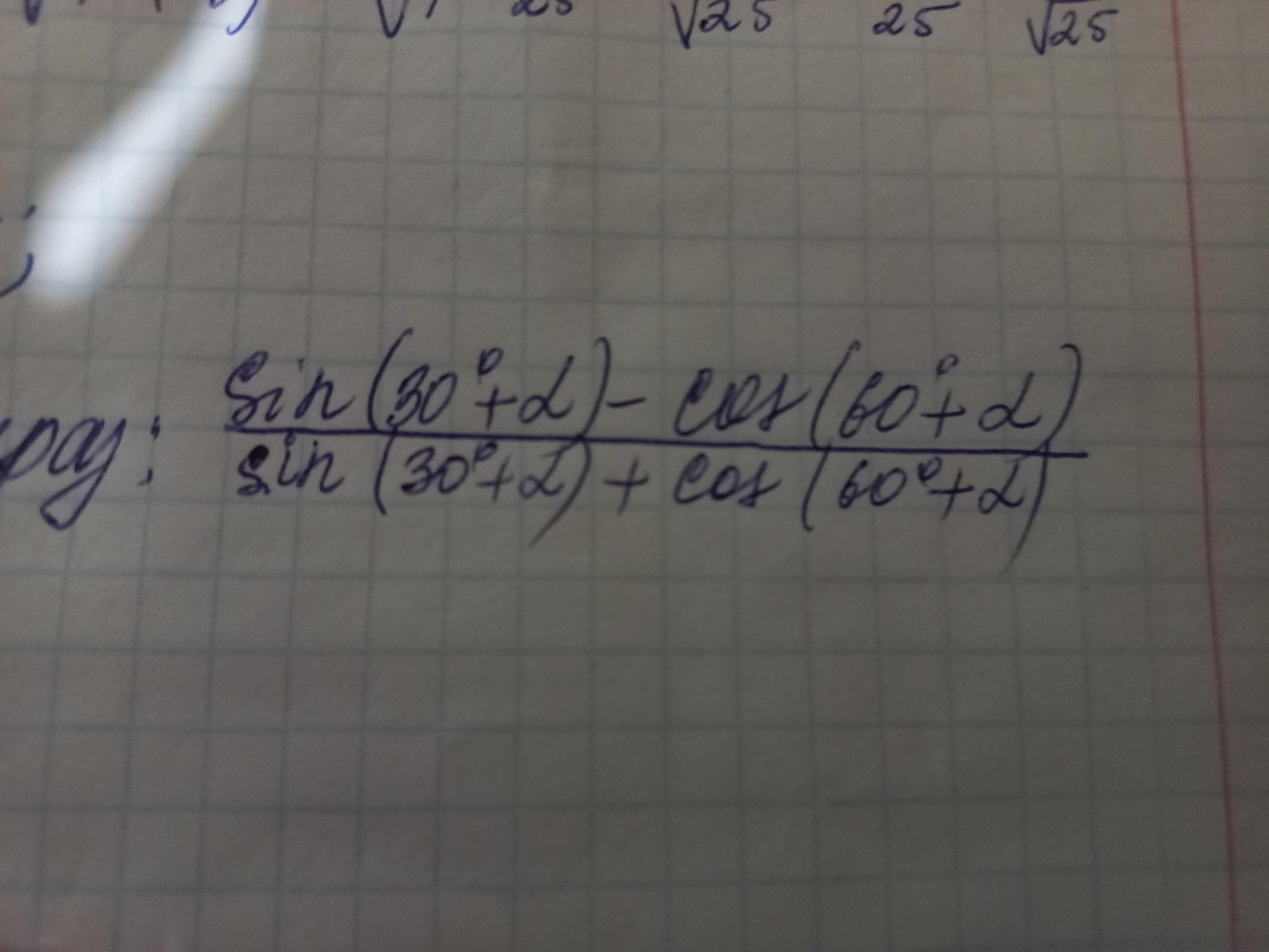 \displaystyle\bf\\\frac{Sin(30^\circ+\alpha )-Cos(60^\circ+\alpha )}{Sin(30^\circ+\alpha )+Cos(60^\circ+\alpha )} =\frac{Cos\Big[90^\circ-(30^\circ+\alpha )\Big]-Cos(60^\circ+\alpha )}{Cos\Big[90^\circ-(30^\circ+\alpha )\Big]+Cos(60^\circ+\alpha) } =