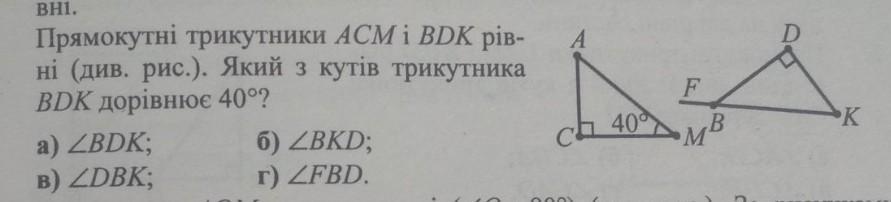 Прямокутні трикутники ACM i BDK piвні (див. рис.). Який з кутів трикутника BDK дорівнює 40°?