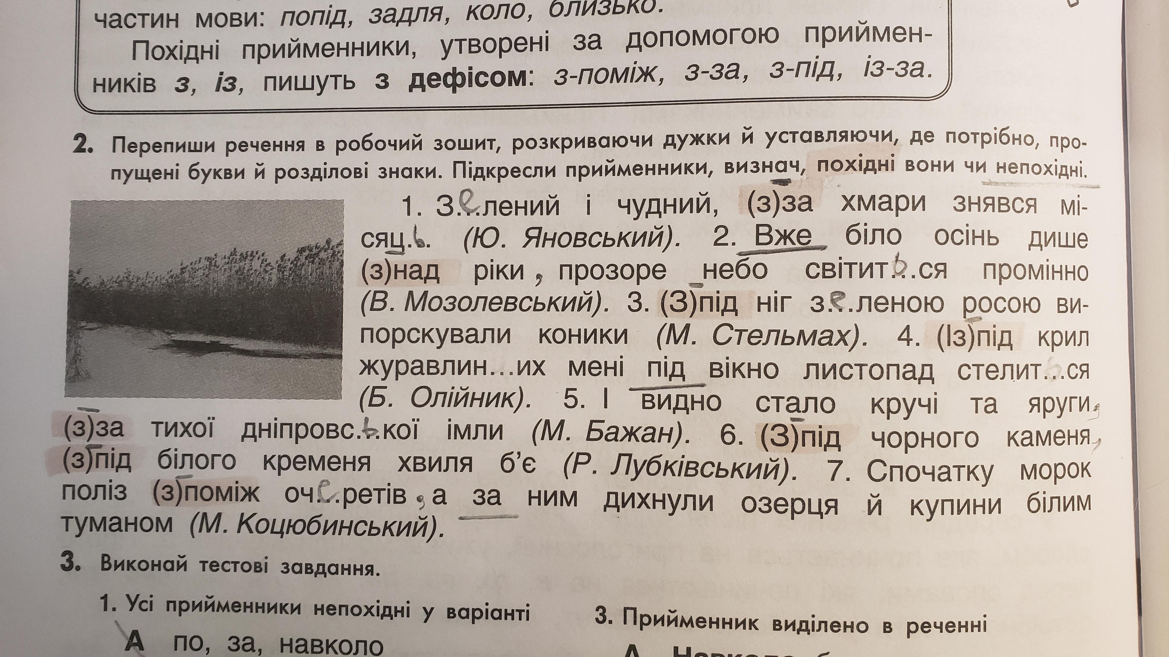 Перепиши речення в робочий зошит, розкриваючи дужки й уставляючи, де потрiбно, про- пущенi букви й розділові знаки. Пiдкресли прийменники, визнач, похiднi вони чи непохiднi. 1. 3...лений і чудний, (3)за хмари знявся мі- біло осінь Дише сяц... (Ю. Яновський). 2. Вже небо свiтит...ся промінно (3)над рiки прозоре (В. Мозолевський). 3. (3)пiд нiг 3...леною росою ви- порскували коники (М. Стельмах). 4. (Із)під крил журавлин...их мені під вікно листопад стелит...ся кручі та яруги (Б. Олійник). 5. I ВИДНО стало 3)за тихої дніпровс...коï iмли (М. Бажан). 6. (3)пiд чорного каменя (Р. Лубківський). 7. Спочатку морок за ним дихнули озерця й купини білим хвиля б'є з)під білого кременя оліз (з)поміж оч...ретів а маном (М. Коцюбинський). ДЕ ТУТ ПРИЙМЕННИКИ ТА ПОХІДНІ ВОНИ ЧИ НЕПОХІДНІ