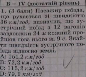 Отже, швидкість зустрічного поїзда відносно землі становить 115,2 км/год (або близько 32 м/с). Тому правильна відповідь - C: 115,2 км/год.