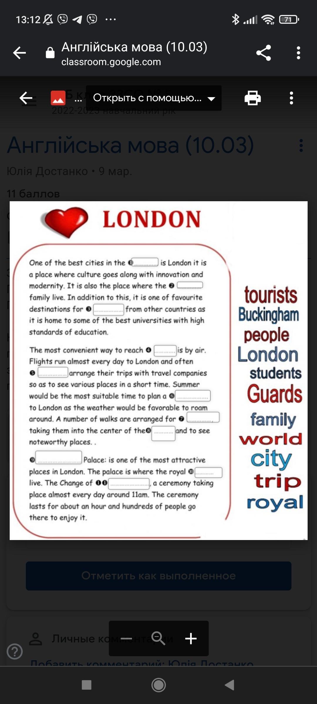 9 Buckingham Palace: is one of the most attractive places in London. The palace is where the royal 10 family live. The Change of 11 Guards a ceremony taking place almost every day around 11 am. The ceremony lasts for about an hour and hundreds of people go there to enjoy it.