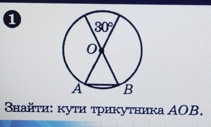Трикутник АОВ вписаний в коло, його вершина О-центр кола а бічні сторони це радіуси кола, тобто вони рівні, отже трикутник АОВ рівнобедренний. Кут 30° (той що зверху) і кут АОВ-вертикальні, тобто рівні. В рівнобедренному трикутнику кути при основі рівні, отже ці кути=(180°-30°)/2=75°