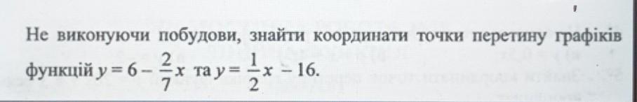 \displaystyle\bf\\y=6-\frac{2}{7} x\\\\y=\frac{1}{2} x-16\\\\\\6-\frac{2}{7}x=\frac{1}{2}x-16\\\\\\6\cdot 14-\frac{2}{7}x\cdot 14=\frac{1}{2}x\cdot 14-16\cdot 14\\\\\\84-4x=7x-224\\\\\\7x+4x=84+224\\\\\\11x=308\\\\\\x=28\\\\\\y=\frac{1}{2} \cdot 28-16=14-16=-2\\\\\\Otvet \ : \ (28 \ ; \ -2)