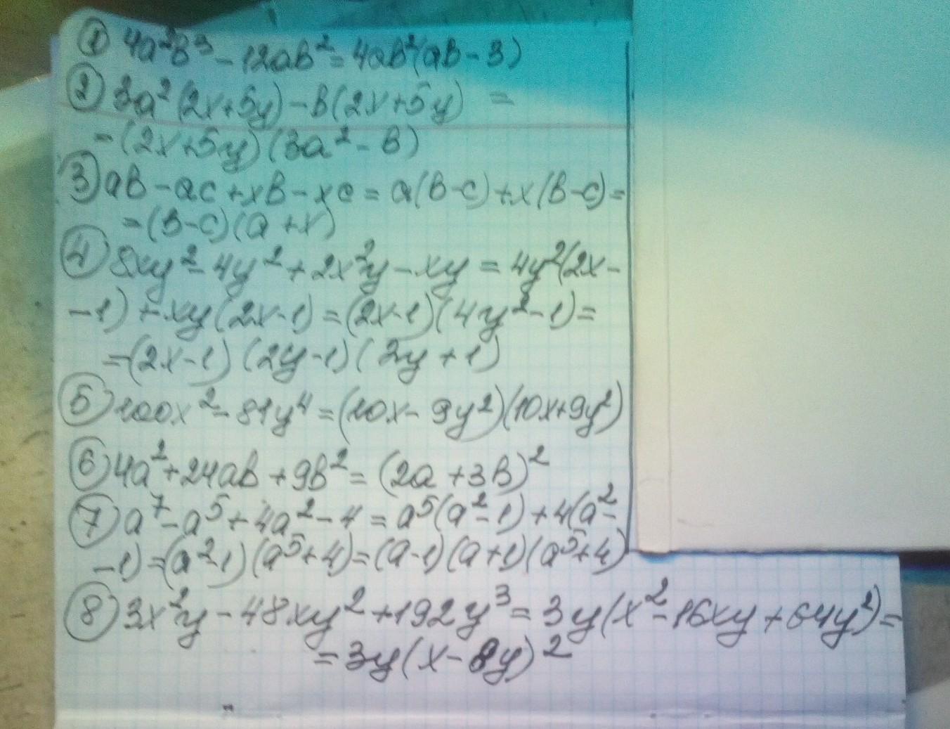 3)ab - ac + xb -xc 4) 8xy^2 - 4y^2 + 2x^2y -xy 5) 100x^2 - 81y^4 6) 4a^2 + 24ab + 9b^2 7) a^7 - a^5 + 4a^2 - 4 8) 3x^2y - 48xy^2 + 192y^3. ПОМОЖІТЬ ПОЖАЛУСТА